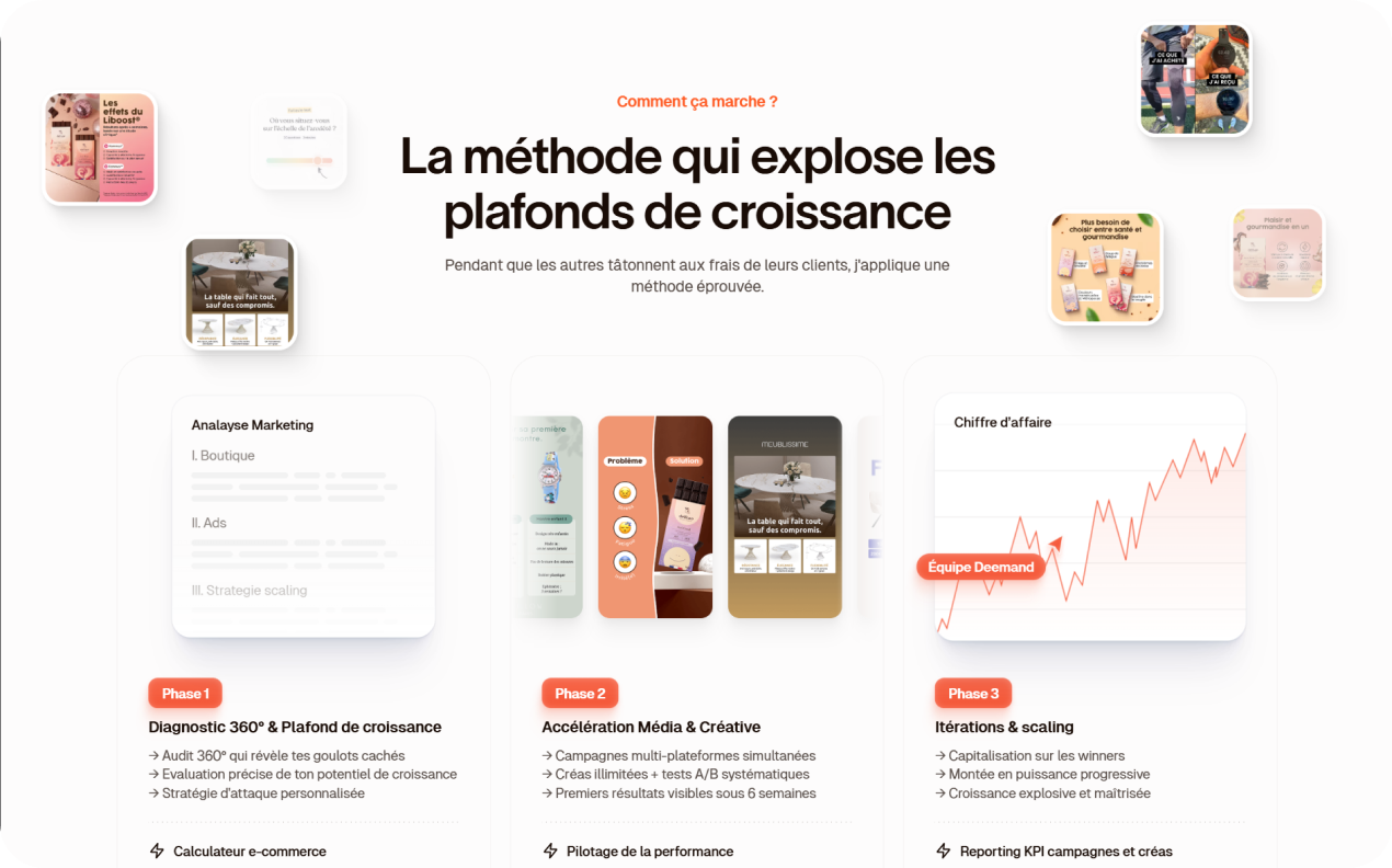 Deemand est une agence d'acquisition e-commerce positionnée comme un Head of Acquisition internalisé — un partenaire dédié au succès pour passer de 0 à 1 million, pas juste une agence de plus.