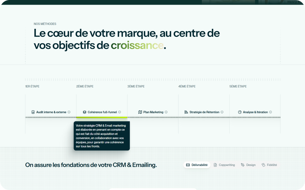 On a mis en avant le process et le fonctionnement de l'agence avec des animations sobres et interactives. Assets de mise en situation pour illustrer l'approche, études de cas pour la preuve.