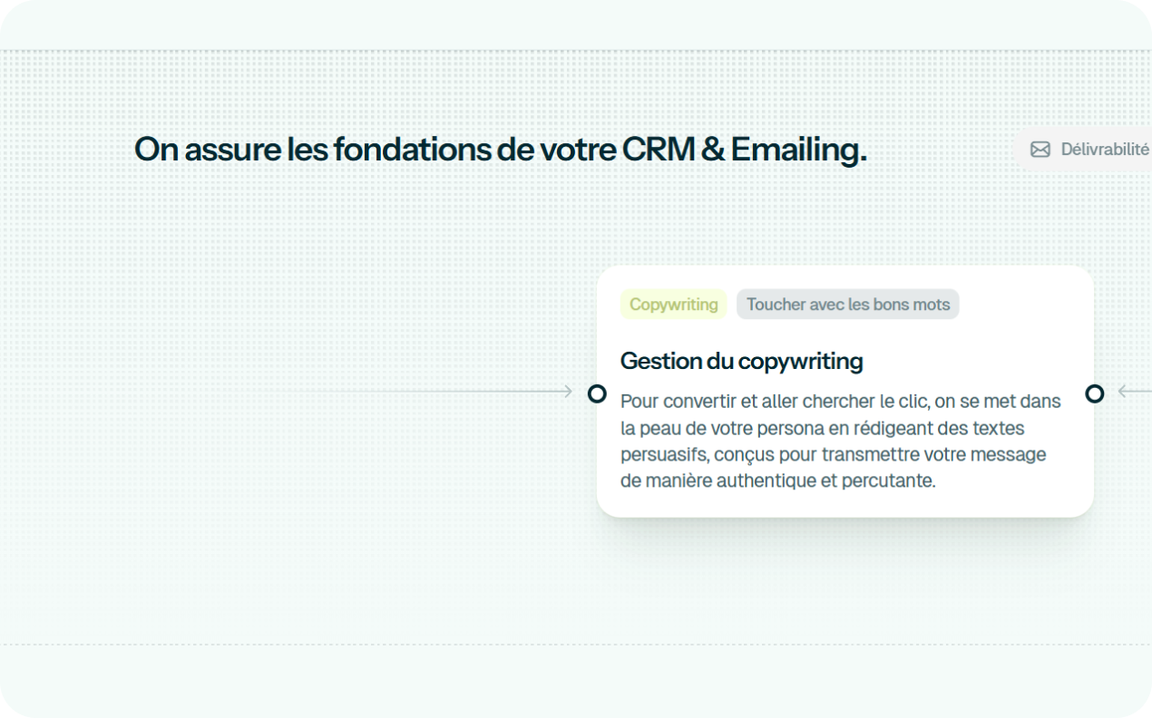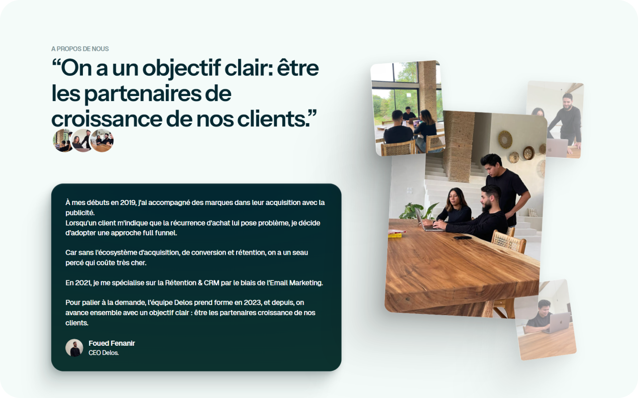 Delos accompagne sur toute la partie CRM et email marketing pour augmenter le CA à partir de la base client existante. L'enjeu : quelque chose de simple avec une DA unique qui met en avant l'email marketing, et créer de la preuve.