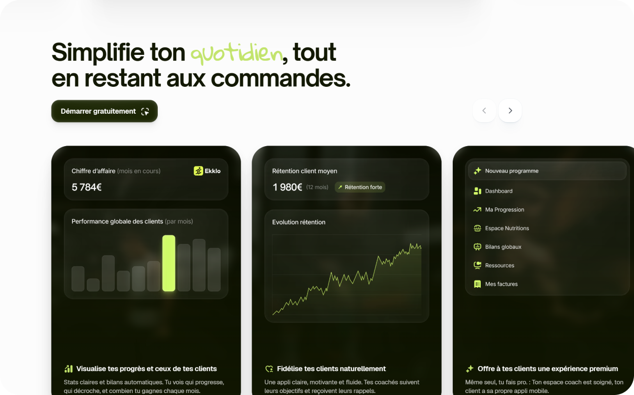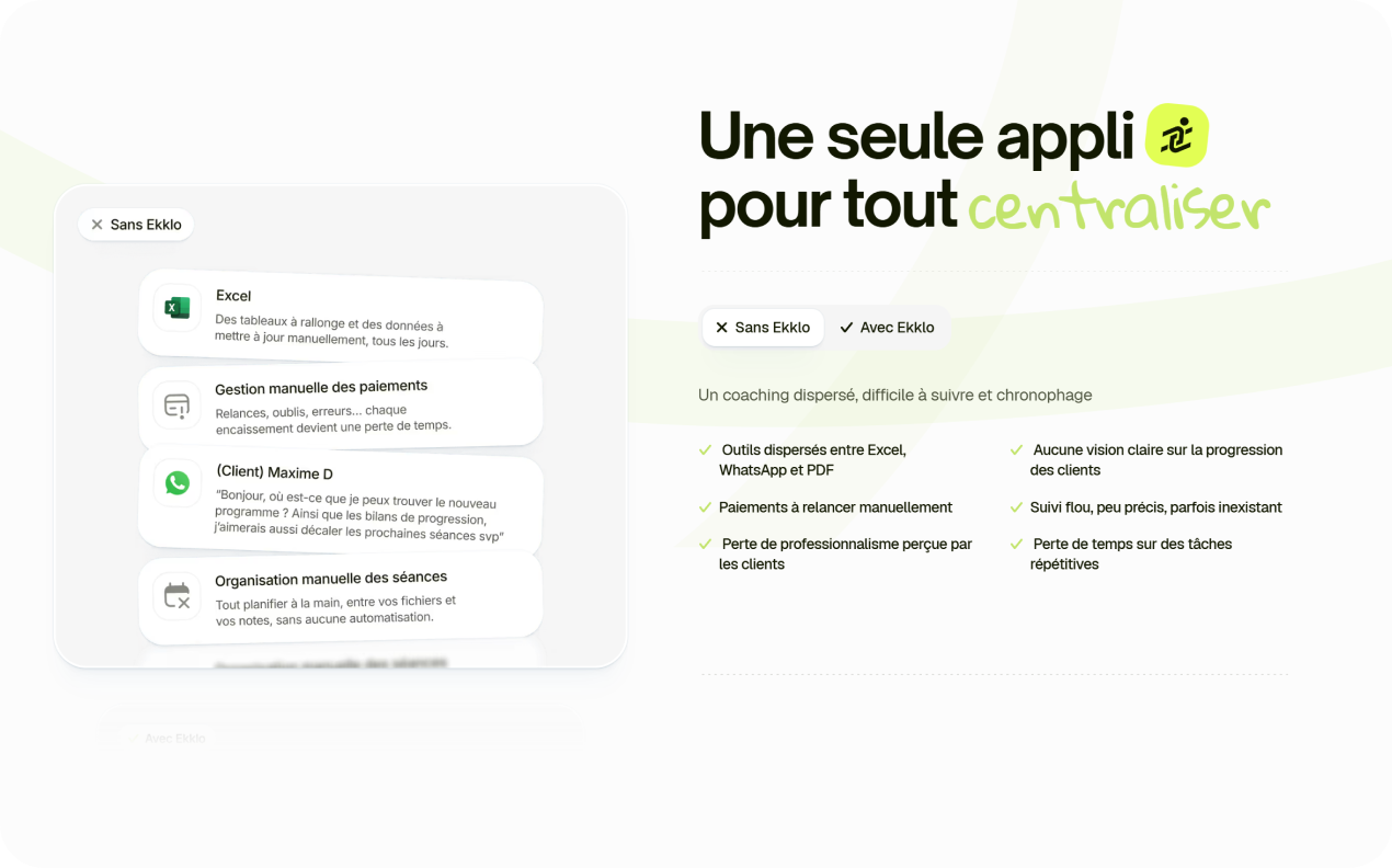 Ekklo est une application 360 dédiée aux coachs sportifs qui centralise tout ce dont ils ont besoin : gestion clients, programmes, paiements, messages et relances.