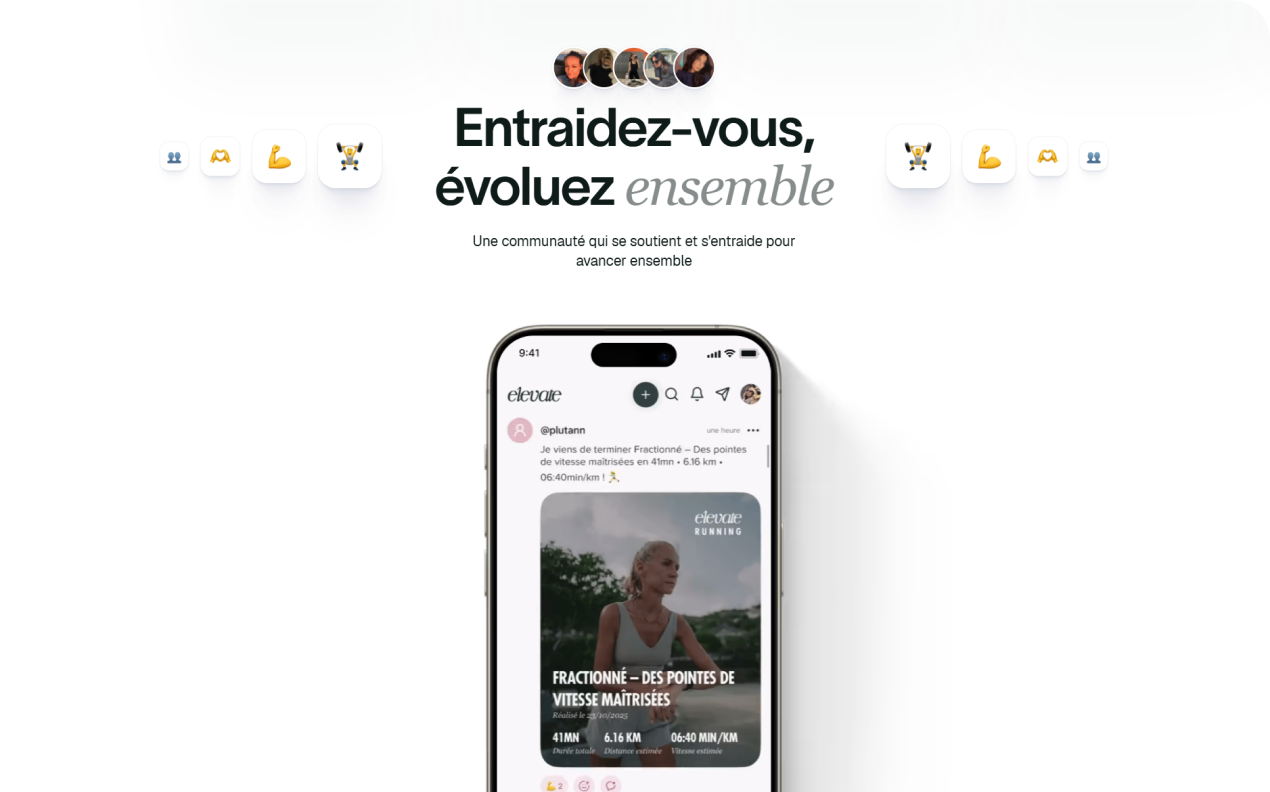 Elevate devait mettre en confiance et prouver les résultats de l'app. L'enjeu : une DA propre au projet, adaptée à l'audience, avec une mise en avant des interfaces et des fonctionnalités sans tomber dans le trop technique.
