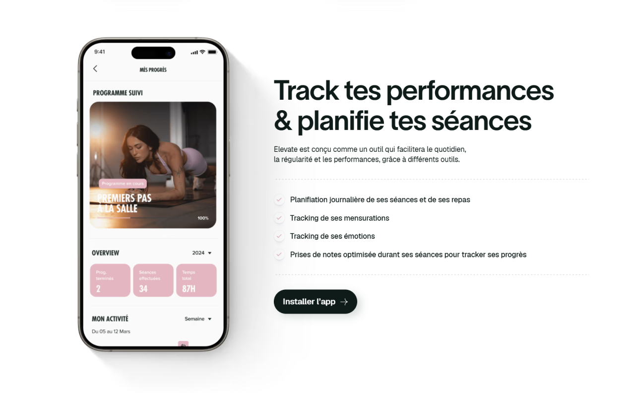 Elevate est une application sportive all-in-one ciblant un public féminin — programmes, nutrition, mindset, communauté, le tout dans une seule app.
