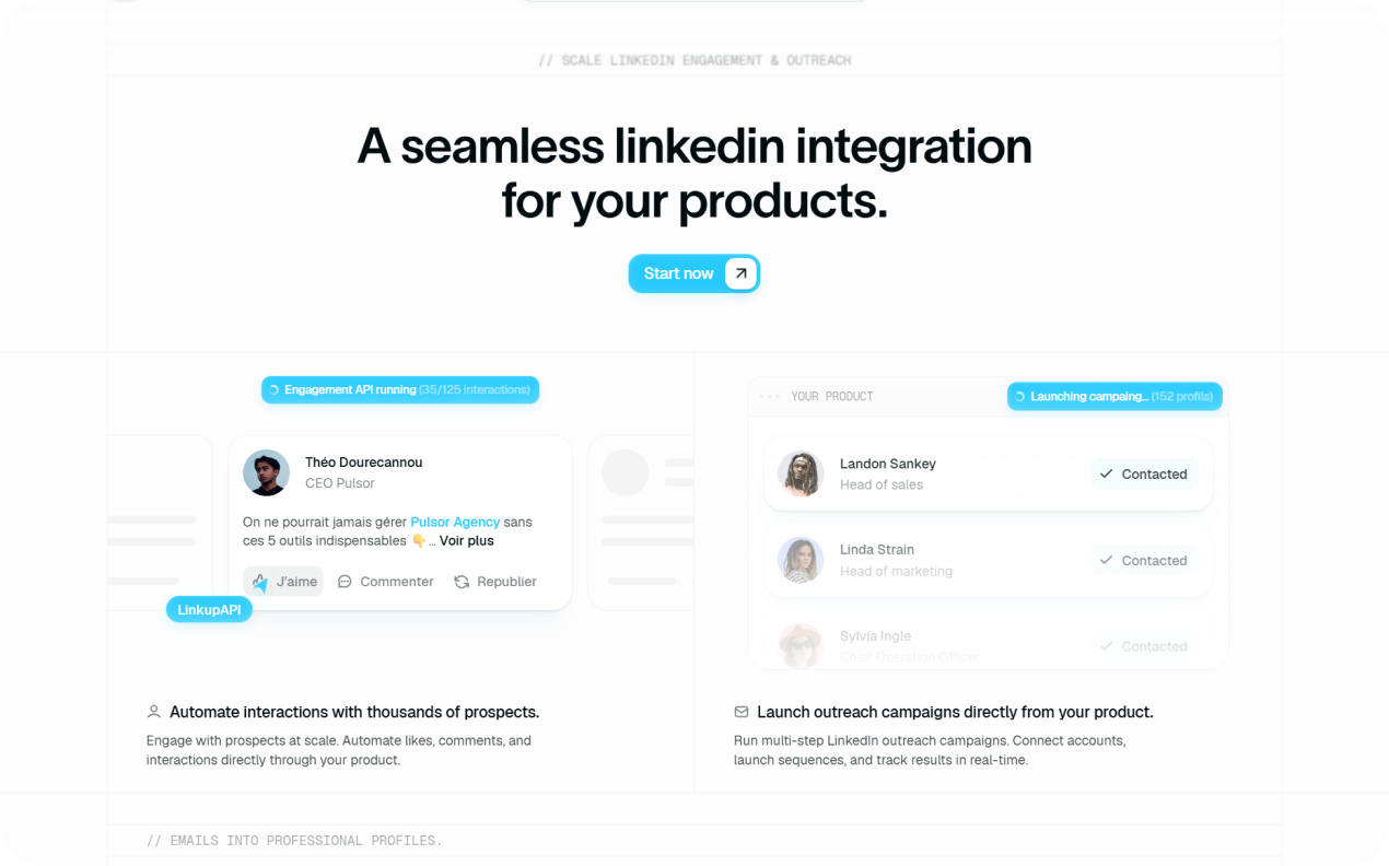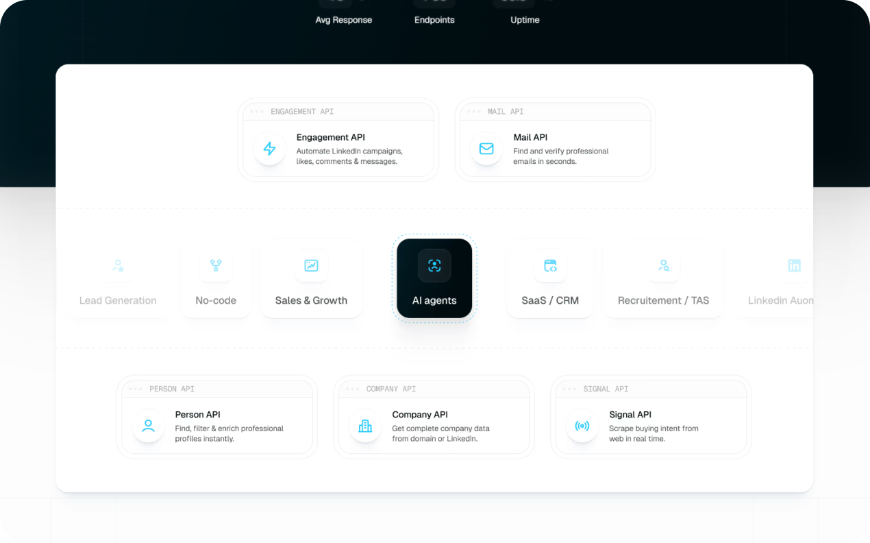 LinkUP API est une API de données B2B avec cinq endpoints différents — informations entreprises, personnes, engagement, mail — connectable à n'importe quel SaaS pour des usages sales, recrutement, agents IA ou CRM.