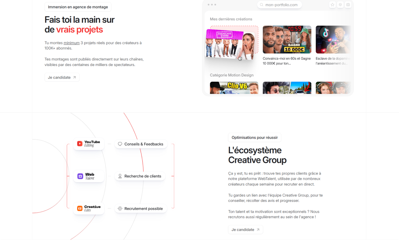 YouTube Editing n'est pas une formation classique : les mentors sont dans le métier et connaissent les tendances. L'enjeu : appuyer sur les pain points des monteurs, introduire la solution, et montrer les créas des monteurs pour donner envie.